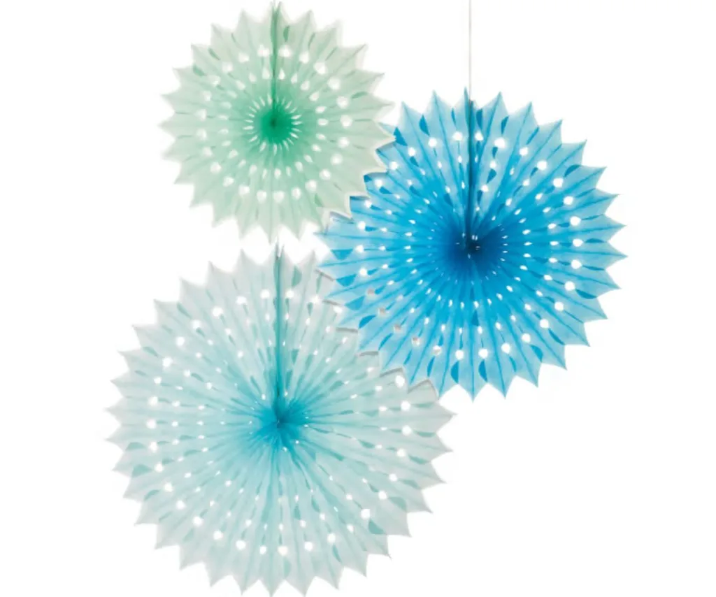 These cute paper fans are the perfect addition to a décor spread. Pair with balloons, table decorations, and their blue counterparts (see below) for the full effect.