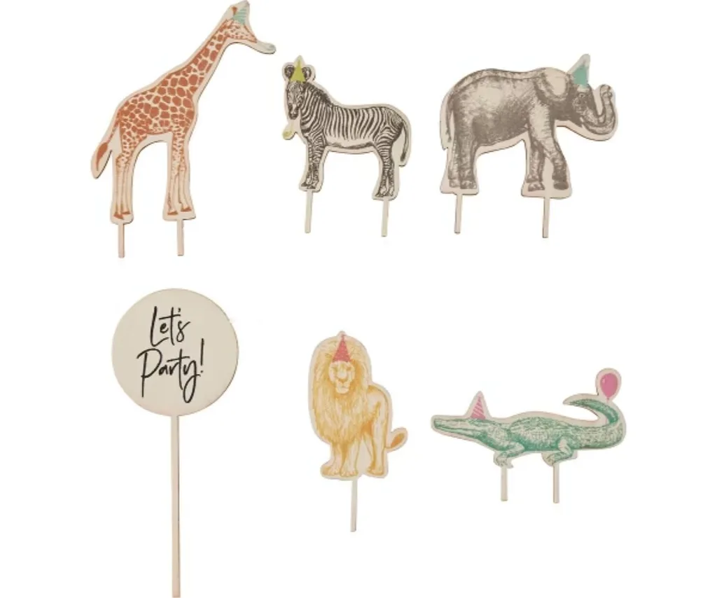 (Image: Kmart)6 Piece Party Animal Wooden Cake Topper, $2 at Kmart