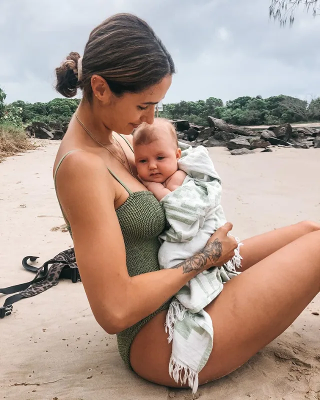 Phwoar! Sarah showing off her incredible body, with baby Frankie in tow.