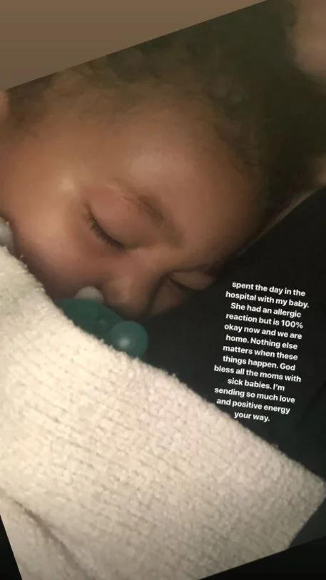 “She had an allergic reaction but is 100% okay now and we are home. Nothing else matters when these things happen. God bless all the moms with sick babies. I’m sending so much love and positive energy your way,” she captioned her pic of her sleeping bub.