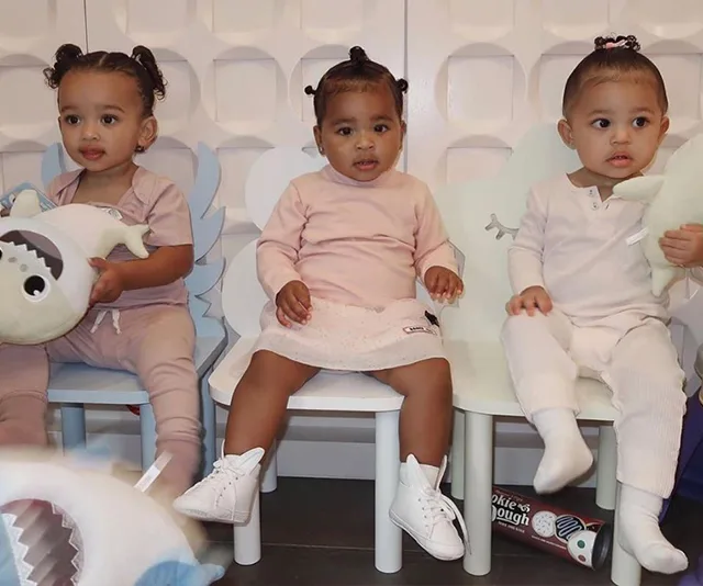 And the three cousins affectionately nicknamed ‘The Triplets’ by Kylie in her caption looked utterly adorable sitting in a row in their baby pink outfits.
