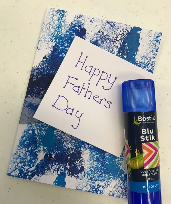 STEP 7: Write out sentiment “Happy Fathers Day”. Here we added bubbles to the lines to give us a funky font. Rub off lines for sentiment and add to card front with glue stick