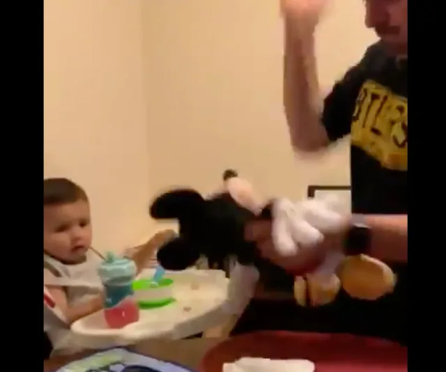 (Image: Twitter @rudyhernandez_)After first offering the infant some food which was refused, the video shows @rudyhernandez_ then offering the same food to Mickey Mouse. He then motions that Mickey Mouse is also refusing the food before putting down the spoon and absolutely ripping into the stuffed toy with a series of closed fist, violent punches to the face and body.