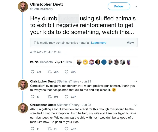 In the video, which Duett captioned “Hey dumb f***ers using stuffed animals to exhibit negative reinforcement to get your kids to do something, watch this…” the thoughtful father uses a stuffed toy to convince his son to eat some food … without the violence.