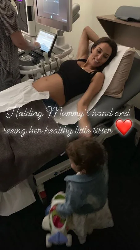Taking to Instagram on Thursday, February 28, Sam posted a candid snap of Snez in a hospital bed waiting for her ultrasound as one-year-old Willow stands beside her holding her hand tight.