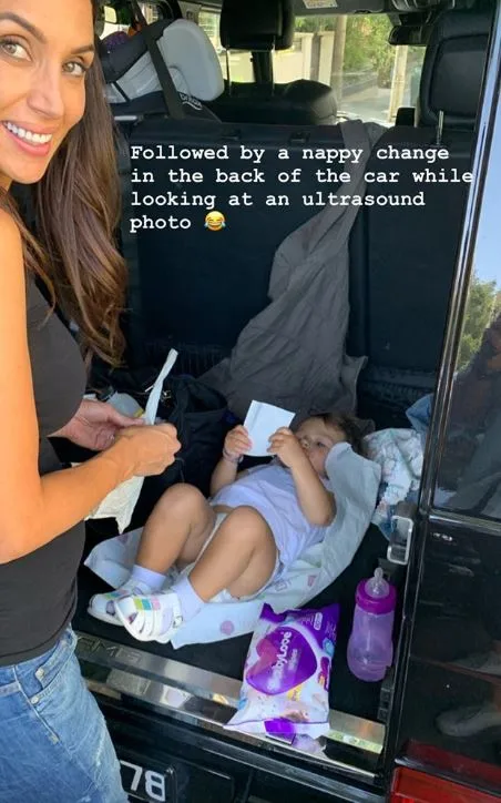 Snez improvises a nappy-change set-up in the boot of their car, while Willow is seen waiting patiently while glued to the ultrasound pic of her unborn baby sister – so cute!