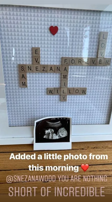 Sharing a final image to his Instagram story on Thursday, the new ultrasound pic was seen next to a quirky scrabble display which spelled out all the family members names along with the words ‘family’, ‘forever’ and ‘love’.