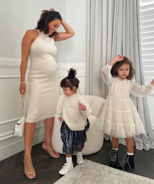 Snez was rocking her growing belly in a beautiful knitted dress while her youngest daughters twinned in matching cream ensembles.