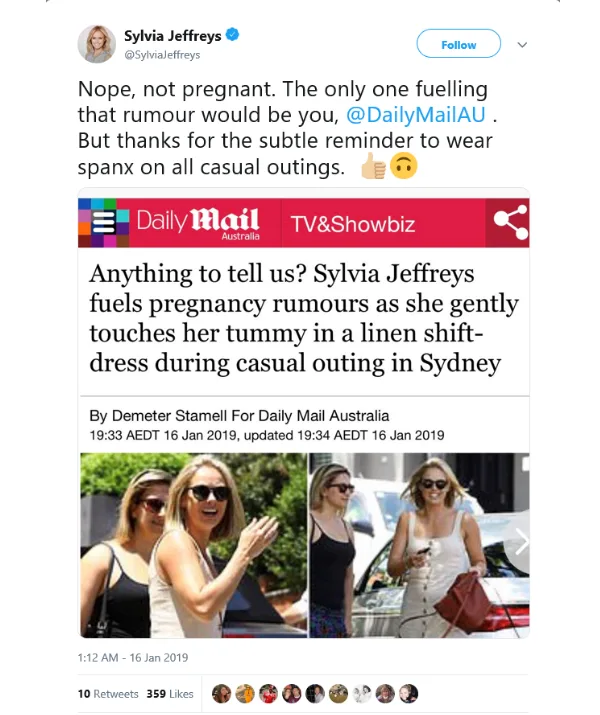 “The only one fuelling that rumour would be you, @DailyMailAU. But thanks for the subtle reminder to wear spanx on all casual outings.”