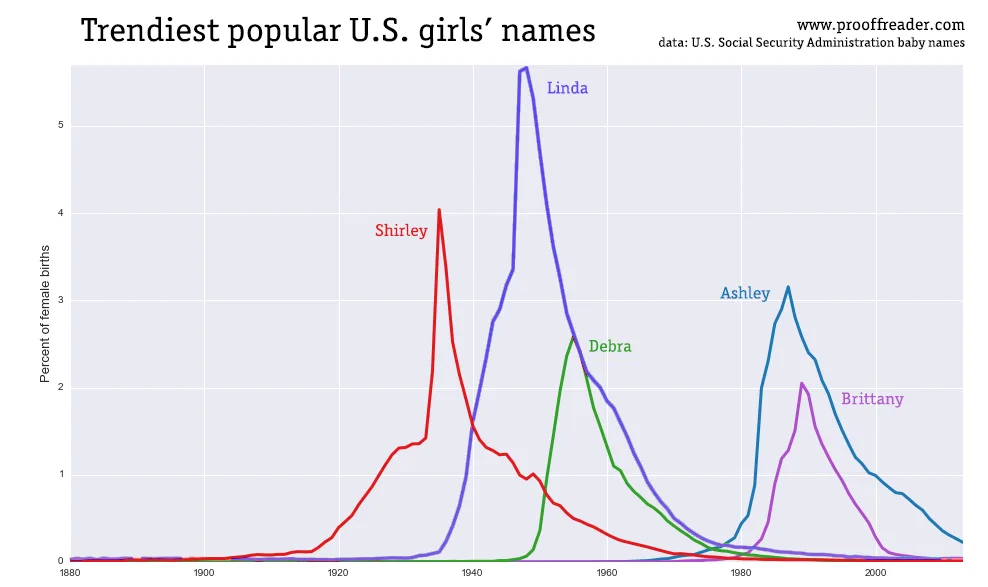 It’s unlikely there will ever be a name that peaks in popularity as much as Linda. Although Sophia was the top name for girls in 2012, it only reached 1.2 per cent of all girls, whereas Mary, the most popular girl’s name (but not for as long as Linda) reached 5.7 per cent.