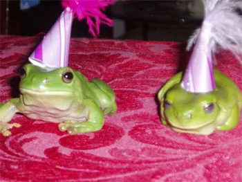 This is our pet green tree frogs Peppermint and Freckle celebrating their 2nd birthday. They love to party in hats.