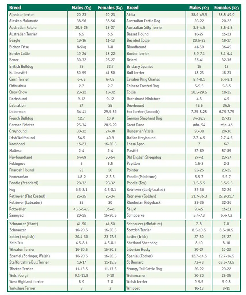 These two factors combined should give you an indication of whether you pet falls into the overweight category, although you also pop them on the scales to check if they are an ideal weight for their breed – as listed in the chart below.