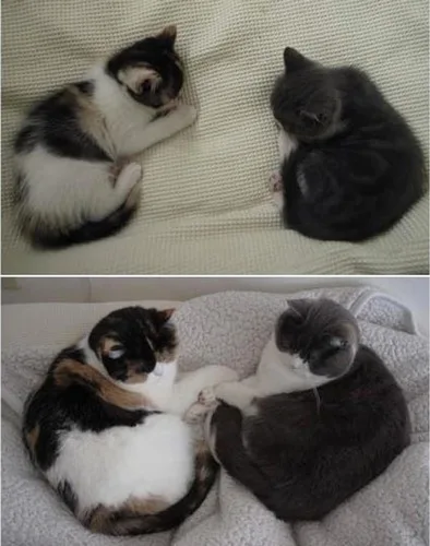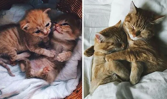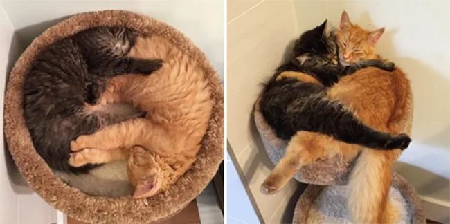 When pet owner Sonja Heriban went to adopt a cat, she found two kitties cuddling and decided to adopt them both. To this day, Renley and Lili remain inseparable and insist on snuggling in the bed they have both outgrown!
