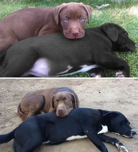 Although these two pictures were only taken within a span of three months, one of the pups has certainly been eating his food — and the other doggo probably wishes he could have his couch back.