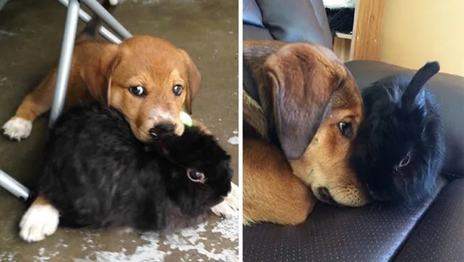 This adopted pup named Whiskey took an immediate liking to his bunny roommate, Munky, and remained best of friends until Munky died of old age in 2016. Moment’s silence, please.