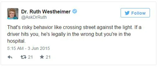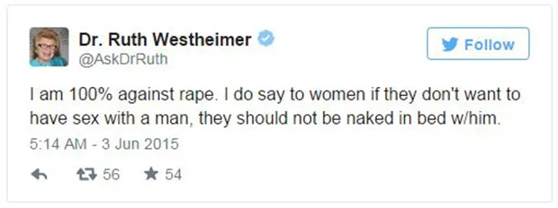 Twitter users weren’t exactly swayed by the sex therapist as one tweeted: “Dr. Ruth this reads like you’re only 60% against rape. What are you doing.”