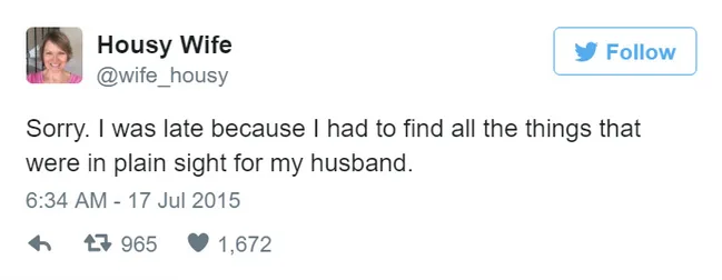 Tweet from Housy Wife joking about being late due to finding items her husband couldn't see.
