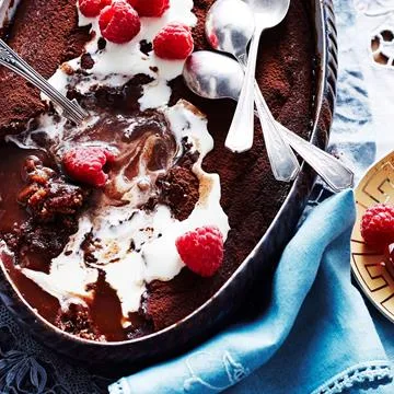 Chocolate pudding with cream, topped with raspberries, with spoons in a black dish on a blue cloth.