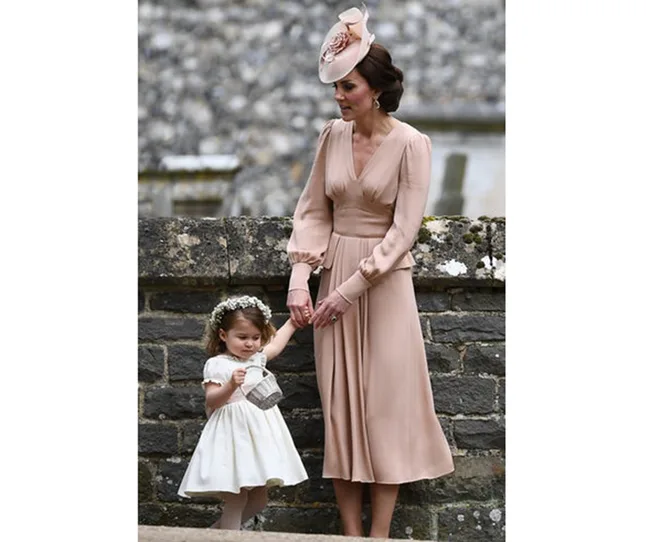 Catherine looked stunning in a blush-coloured Alexander McQueen tea dress and matching hat at her sister Pippa’s wedding to James Matthews in May 2017.