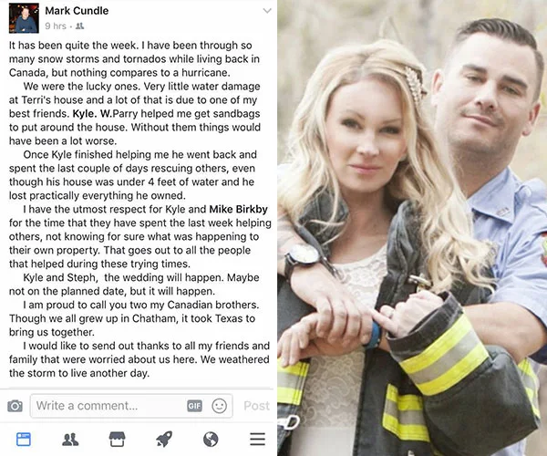 Firefighters like Kyle Parry, who didn’t have time to think about his wedding in 13 days or even his own home just north of Beaumont, Texas.