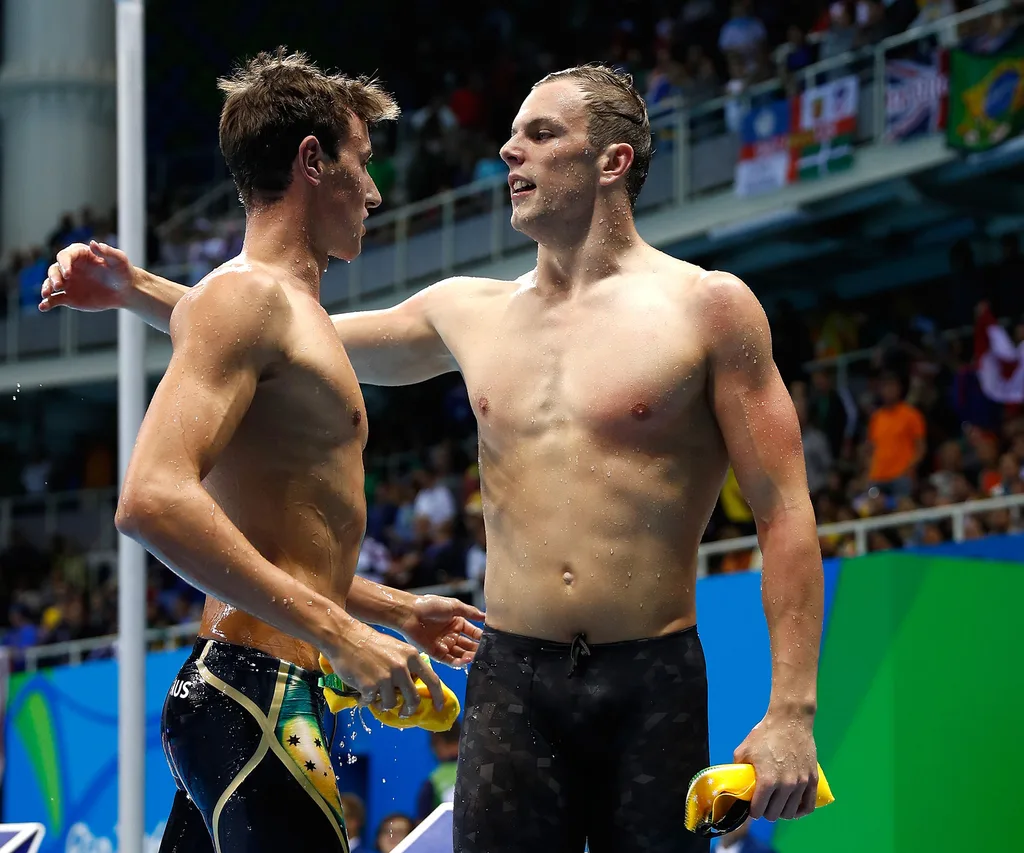 Fellow Aussie Cameron McEvoy congratulates Kyle Chalmers on his win.