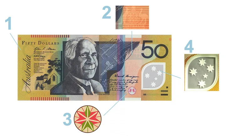 If you hold the banknote to the light, you should see the Australian Coat of Arms.