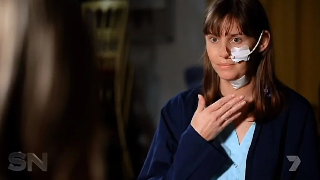 The 31-year-old told Seven’s Sunday Night program she had been hiding under a table when one of the men spotted her, dragged her out and then stabbed her in neck.