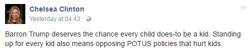 “Barron Trump deserves the chance every child does-to be a kid,” Chelsea wrote.