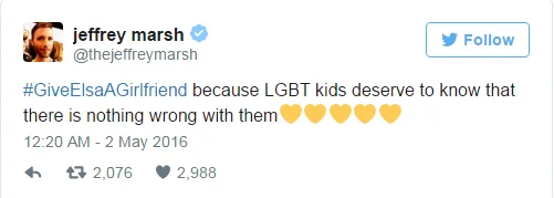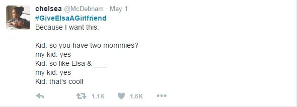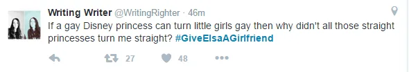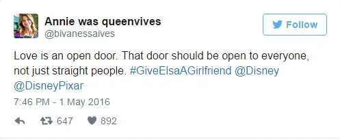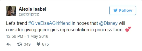 The hashtag refers to Elsa, the ‘Let It Go’ princess come queen from the smash hit 2013 film, Frozen, and the fact that she wants to see a lady love interest in the upcoming sequel, Frozen 2.