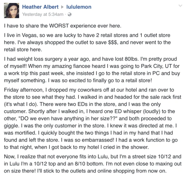 Heather Albert was on a business trip to Utah when she stopped by the Lululemon store for some retail therapy. After dropping 36kg through weight-loss surgery a year ago, she was encouraged by her fiancé to buy herself some new workout gear to celebrate. What was intended to be a quick shopping trip before a work function turned into a humiliating experience when she “heard one ED [sales assistant] whisper (loudly) to the other, “DO we even have anything in her size?” and both proceeded to giggle” with the exchange leaving Albert mortified.