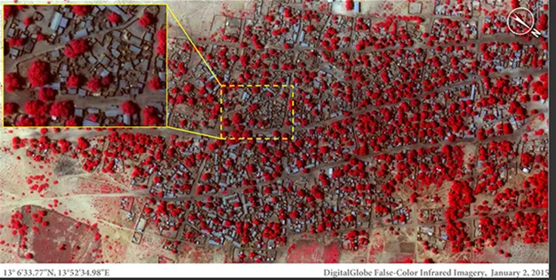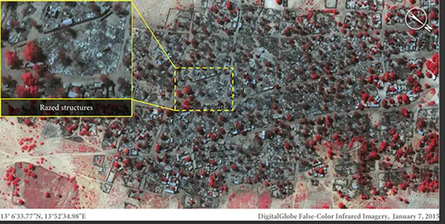 Satellite images of the area released by Amnesty International depict the enormous trail of destruction left by the terrorists. Children, women and old people who couldn’t run away fast enough were reported to have been the first killed when they stormed into the town.