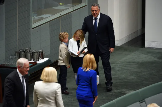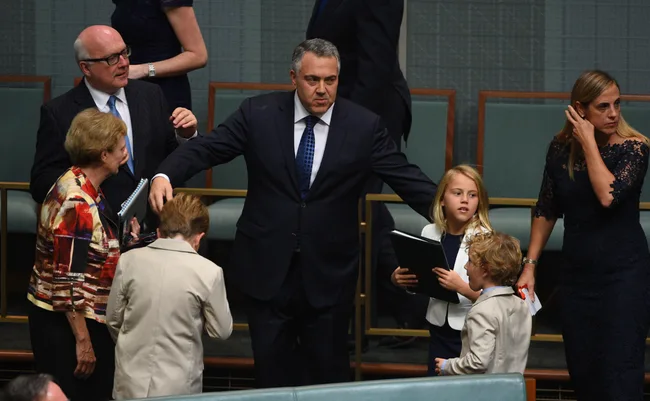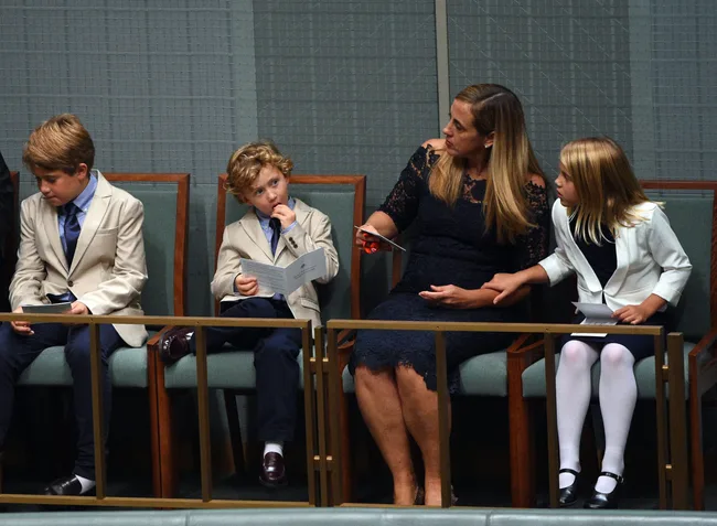 From left to right, Joe Hockey’s son’s Xavier and Ignatius, wife Melissa Babbage, and daughter, Adelaide sit together at Parliament House.
