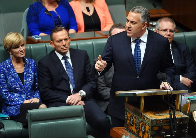 Treasurer Joe Hockey delivers his second budget as Treasurer, as Julie Bishop and Tony Abbott support him from the front bench.