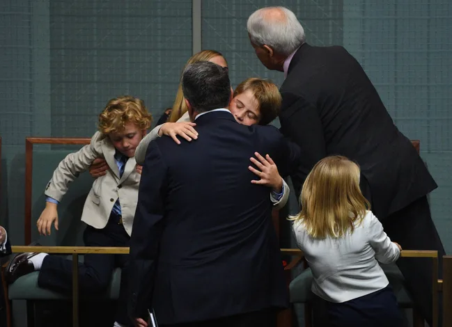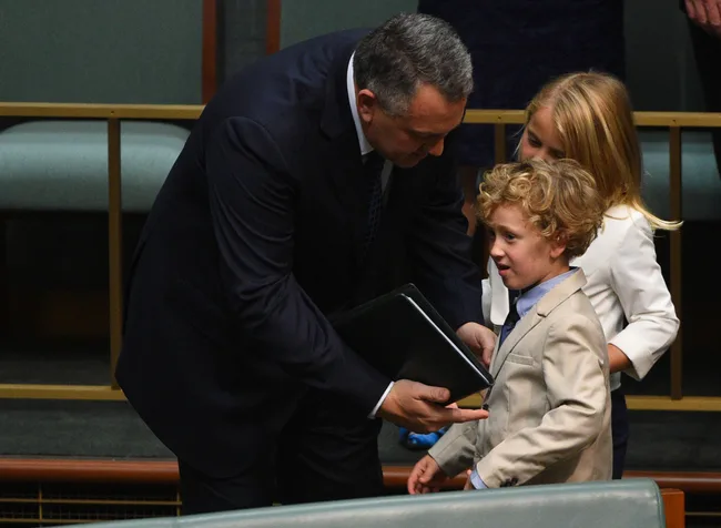 Mr. Hockey’s eldest son, Xavier, gives his father a hug after the federal budget speech.