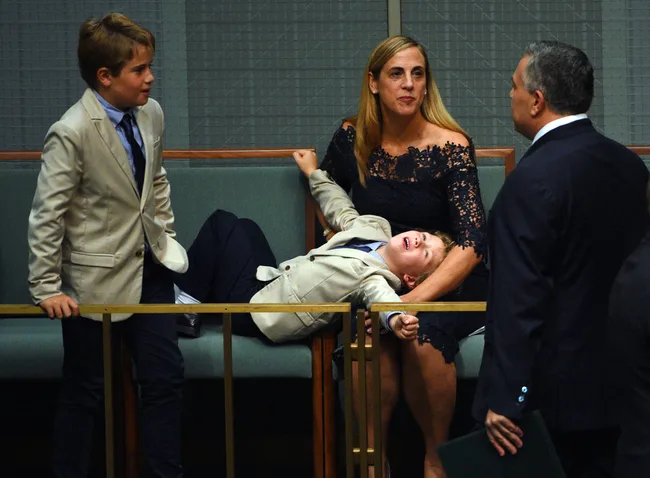 Young Ignatius stretched on his mother, Melissa Babbage’s lap as she chatted to her husband, Joe Hockey.