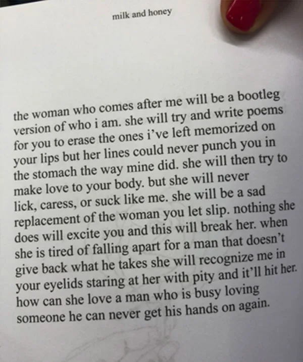 In part, the poem read: “The woman who comes after me will be the bootleg version of who I am, she will try and write poems for you and erase the ones I’ve left memorised on your lips but her lines could never punch you in the stomach the way mine did.
