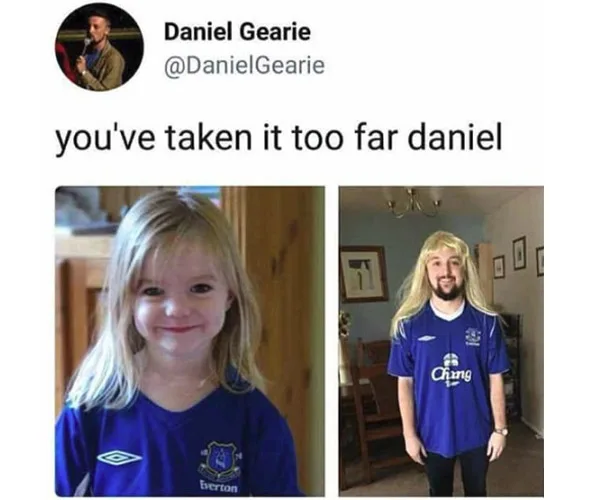 Daniel Gearie, 25, wore an Everton shirt and a blonde wig and posted the picture alongside an image of Maddie.