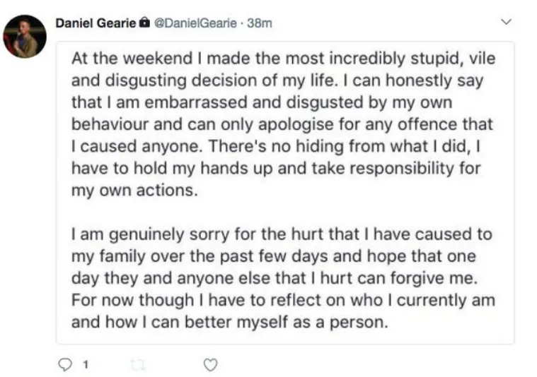 However, the backlash was so severe with other users calling him “vile” and “sick”, Gearie deleted the posts and turned his Twitter page to private. He also issued the following apology: