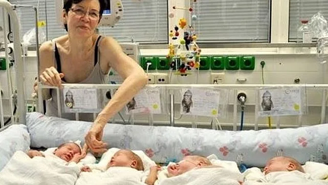 The babies – Neeta, Bence, Fjonn and Dries – were delivered by caesarean section in Berlin. Her brood is now aged from three months (the quadruplets) to 44 (her eldest son.)