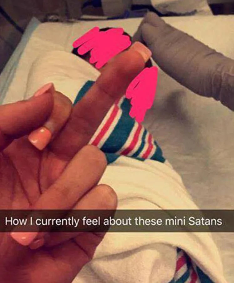 The image (below) shows a screenshot from a Snapchat sent by a nurseto friends. The image depicts a hand sticking her middle finger up at the newborn baby and is captioned, “How I currently feel about these mini Satans.”