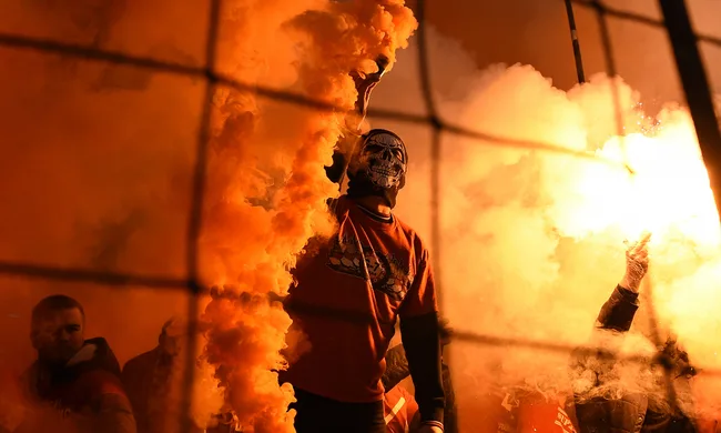 Football fans light fires during the FC Spartak Moscow and FC Krylia Sovetov Samara match in Russia.