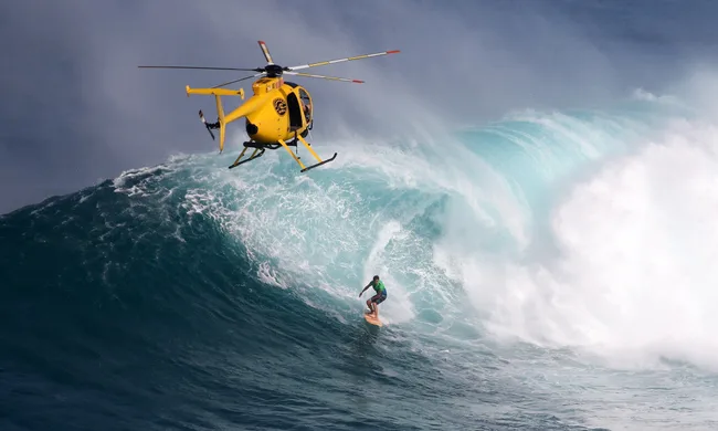 Surfer Albee Layer catches a wave during the Jaws Surf Break challenge in Hawaii.