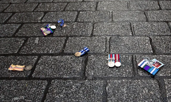 War veterans abandon their medals to the ground in protest of the UK’s part in the war in Syria.