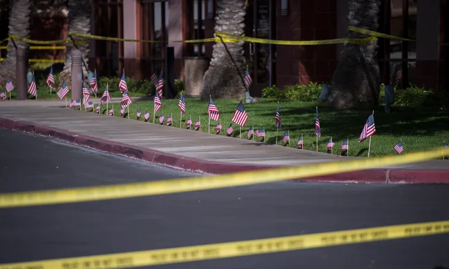 American flags line the sidewalk where the San Bernardino shooting took place.
