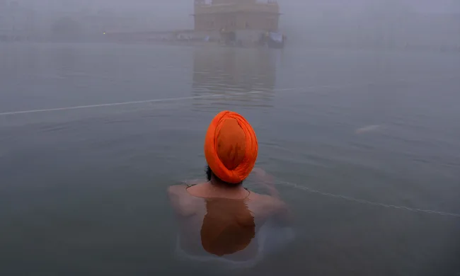 A Sikh man baths in the waters of the Golden Temple in Amritsar.