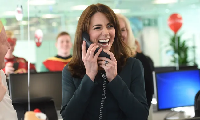 Catherine, Duchess of Cambridge, laughs as she takes a call during the ICAP Charity Day.