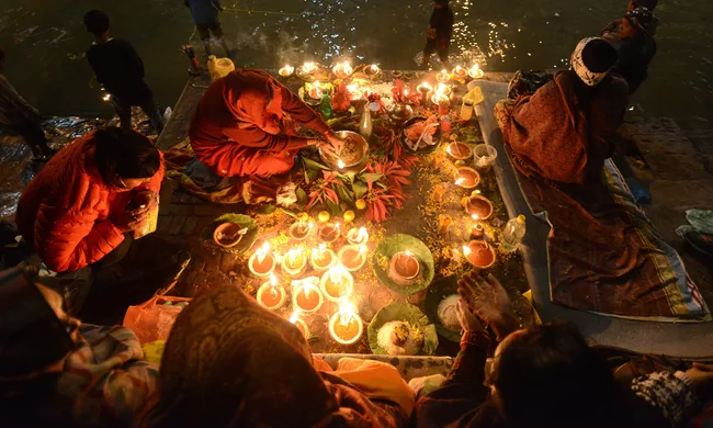 Hindu worshippers light oil lamps in memory of the deceased during the Balachaturdashi festival at the Pashupatinath Temple in Kathmandu, Nepal.