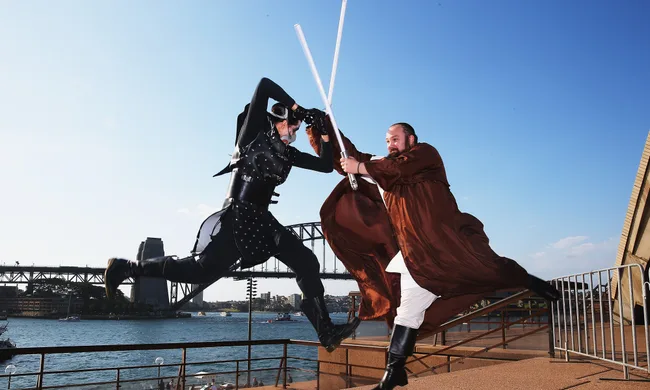 Fans fight a mock battle outside the Sydney Opera House where a fan event for the new Star Wars film was being held.