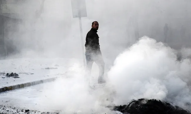 A man walks through the smoke of a demonstration in Sur, Turkey, which is under strict curfew due to recent bombing.
