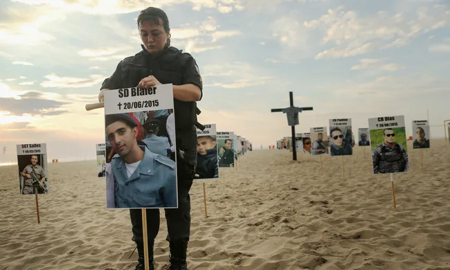 A police officer adjusts a tribute to a fallen soldier for a memorial on Brazil’s Rio de Janiero beach.